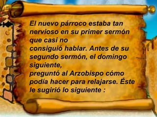 El nuevo párroco dio un sermón muy animado después de tomar vodka antes de subir al púlpito, siguiendo el consejo del Arzobispo para relajarse. Sin embargo, el Arzobispo luego le dejó una nota detallando varios errores en su presentación, como referirse a Jesús y sus apóstoles de manera informal y hacer comentarios ofensivos sobre el Arzobispo.