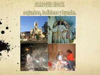 La parroquia Sidcay en Ecuador tiene una rica historia y cultura. Algunas de sus tradiciones incluyen jugar el juego de mesa "huairo" durante los velorios y realizar "mingas" donde la comunidad se une para ayudar a otros. También celebran fiestas como la de la Virgen de la Merced en septiembre y realizan procesiones durante la Semana Santa. Sidcay mantiene costumbres y tradiciones a pesar del paso del tiempo.