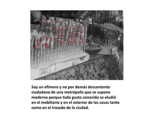 Este documento describe la vida en una gran metrópolis moderna donde todo parece estar estandarizado y la gente vive de manera similar sin necesidad de conocerse. El autor se siente un ciudadano efímero y descontento en esta ciudad donde no hay vestigios de la religión y el lenguaje y la moral se han simplificado. Desde su ventana, ve nuevos espectros que circulan entre el humo de carbón, representando las sombras de la ciudad moderna.