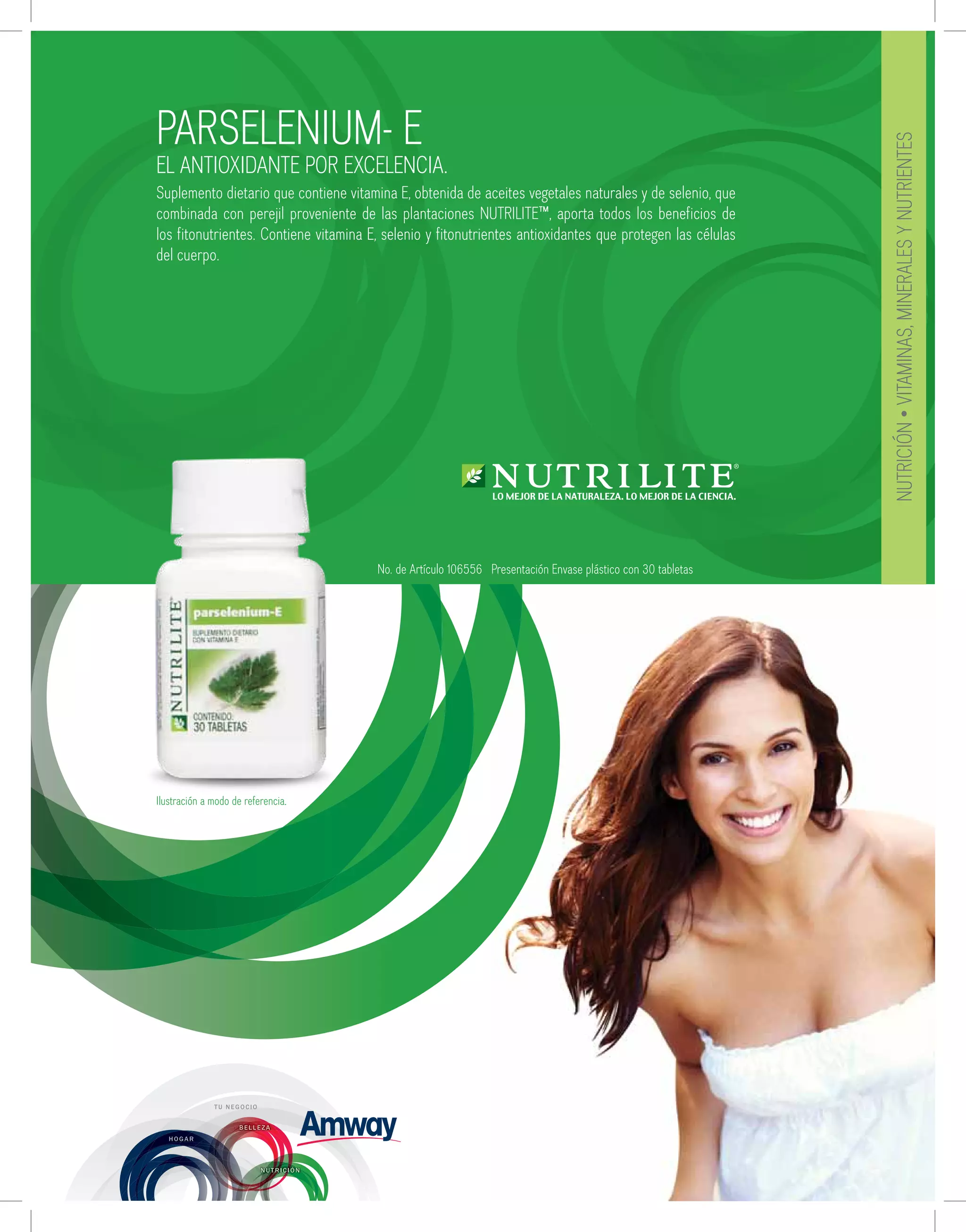 Este suplemento dietético contiene vitamina E obtenida de aceites vegetales y selenio, los cuales se combinan con fitonutrientes antioxidantes del perejil para proteger las células del cuerpo. Cada tableta proporciona 400UI de vitamina E y 10mcg de selenio, aportando beneficios antioxidantes para la salud cardiovascular y el sistema inmunológico. Se recomienda tomar una tableta diaria para fortalecer el sistema antioxidante.