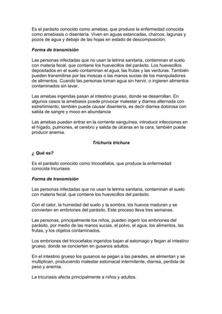 Este documento describe los principales parásitos intestinales que afectan al ser humano, incluyendo Giardia lamblia, Entamoeba histolytica, Trichuris trichura, Ascaris lumbricoides, Ancylostoma duodenale y Necator americanus, Taenia saginata y Taenia solium. Explica lo que son estos parásitos, cómo se transmiten y las enfermedades que causan. También proporciona medidas generales para prevenir la parasitosis intestinal, como lavarse las manos, hervir el agua y tener un sistema