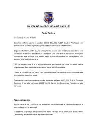 1) La policía solicita información sobre el paradero de Ricardo Rubén Díaz de 74 años que salió de su casa en Villa Mercedes el lunes pasado en su bicicleta roja con destino a una clínica y aún no ha regresado.