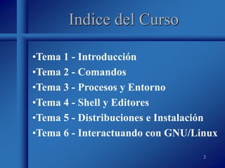 Este documento presenta un curso introductorio sobre GNU/Linux. Incluye seis temas principales: introducción, comandos, procesos y entorno, shell y editores, distribuciones e instalación, e interacción con GNU/Linux. Explica conceptos clave como qué es GNU/Linux, su historia, usuarios y permisos, y el sistema de archivos.