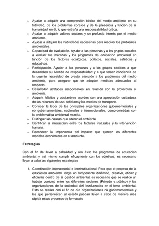 El documento define la educación ambiental y describe su evolución y objetivos. Explica que la educación ambiental busca crear conciencia sobre la relación entre humanos y medio ambiente para promover un comportamiento sostenible. También describe estrategias como la coordinación interinstitucional, la inclusión en la educación formal y no formal, y la participación ciudadana para lograr los objetivos de la educación ambiental.