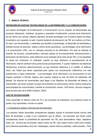Las nuevas tecnologías de la información y la comunicación (TIC) son herramientas que facilitan el procesamiento, almacenamiento y transmisión de información. En educación, las TIC son recursos didácticos que mejoran el aprendizaje y permiten la innovación educativa. Los alumnos deben desarrollar competencias digitales para aprovechar las TIC de forma crítica. Los alumnos con necesidades educativas especiales se benefician de las adaptaciones y apoyos individualizados que brindan las TIC.