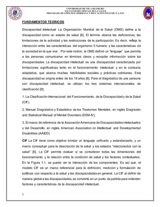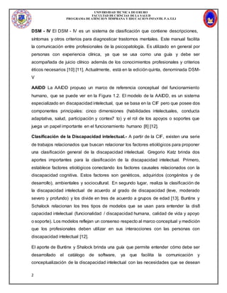 El documento habla sobre la discapacidad intelectual, definida por la OMS como limitaciones significativas en el funcionamiento intelectual y la conducta adaptativa. Describe los tres sistemas de clasificación utilizados (CIF, DSM-IV, AAIDD) y tipos comunes de discapacidad intelectual como el síndrome de Down, autismo y parálisis cerebral. Finalmente, destaca algunas ventajas del uso de las TIC para mejorar las capacidades cognitivas y comunicación de las personas con discapacidad intelectual.