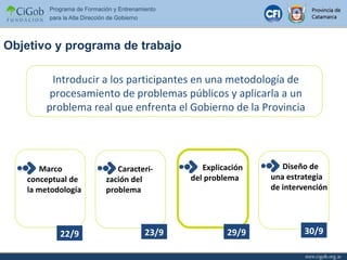 El documento presenta un módulo de procesamiento de problemas públicos en Catamarca, que busca introducir a los participantes en metodologías para abordar problemas reales del gobierno provincial. Se detallan pasos específicos para identificar, describir y formular estrategias de intervención sobre problemas relacionados con la insuficiencia de servicios básicos. Además, se establecen procedimientos para operacionalizar un plan que permita realizar mejoras significativas en la comunidad.