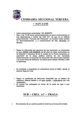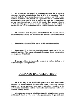 El documento contiene varios reportes policiales breves de distintas dependencias. Reporta un fallecimiento por causas naturales, un accidente de tránsito fatal, detenciones por disturbios e inhalación de pegamento y un principio de incendio en un camión que pudo ser controlado a tiempo.