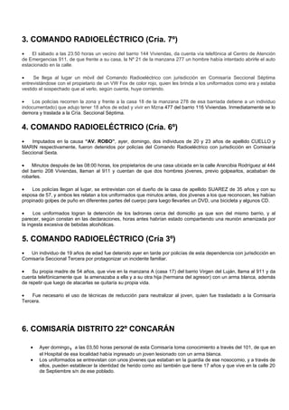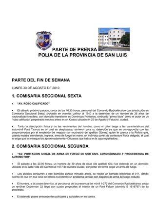 Este documento resume 5 incidentes policiales ocurridos durante el fin de semana en la provincia de San Luis. Incluye el arresto de un hombre por robo calificado en un kiosco, la detención de otro hombre por portar un arma de fuego ilegalmente, la captura de un adolescente indocumentado por intentar robar un auto, el arresto de dos hombres por robar una casa luego de golpear a sus dueños, y la detención de un joven que amenazó a su madre y hermana con un arma blanca. También describe la muerte de un adolescente