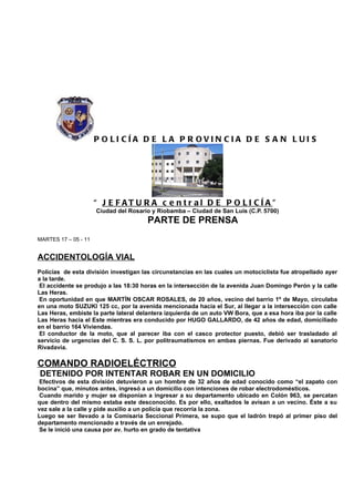 El documento resume varios incidentes policiales en la provincia de San Luis. En uno, un motociclista fue atropellado en una intersección. En otro, la policía detuvo a un hombre que intentó robar electrodomésticos de un departamento. También detuvieron a dos hombres por arrebatarle la cartera a una mujer. Por último, arrestaron a dos personas, uno de ellos menor de edad, por caminar en los techos con intenciones de robo.