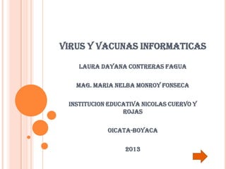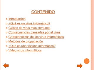 Este documento proporciona información sobre virus y vacunas informáticas. Explica que un virus informático es un programa malicioso que altera el funcionamiento de una computadora sin el permiso del usuario e infecta otros archivos. Describe varios tipos comunes de virus como hoaxes, caballos de Troya y gusanos. También detalla las consecuencias y características de los virus, así como sus métodos de propagación a través de redes. Finalmente, define una vacuna informática como un programa antivirus que detecta y elimina virus para proteger las computadoras