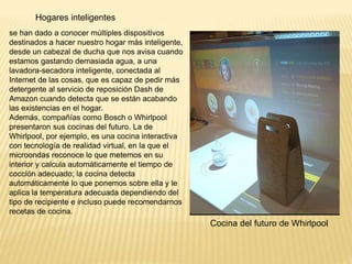 Este documento resume cinco tendencias tecnológicas destacadas en la feria CES 2016: 1) Los hogares inteligentes con dispositivos conectados que automatizan tareas; 2) Vehículos inteligentes con interfaces basadas en gestos y conducción autónoma; 3) Drones cada vez más autónomos; 4) Televisores con mayor resolución y tecnología HDR; 5) La nueva batería de Tesla que podría revolucionar el almacenamiento de energía.