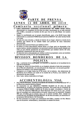 El documento resume varios incidentes reportados por la policía local. Incluye el arresto de un hombre por intentar robar herramientas de un automóvil estacionado, un incendio en un depósito que causó solo daños materiales, y un accidente automovilístico en el que una mujer embarazada resultó con shock. También describe una serie de allanamientos en dos barrios que condujeron al arresto de 10 hombres en relación con una investigación de robos.