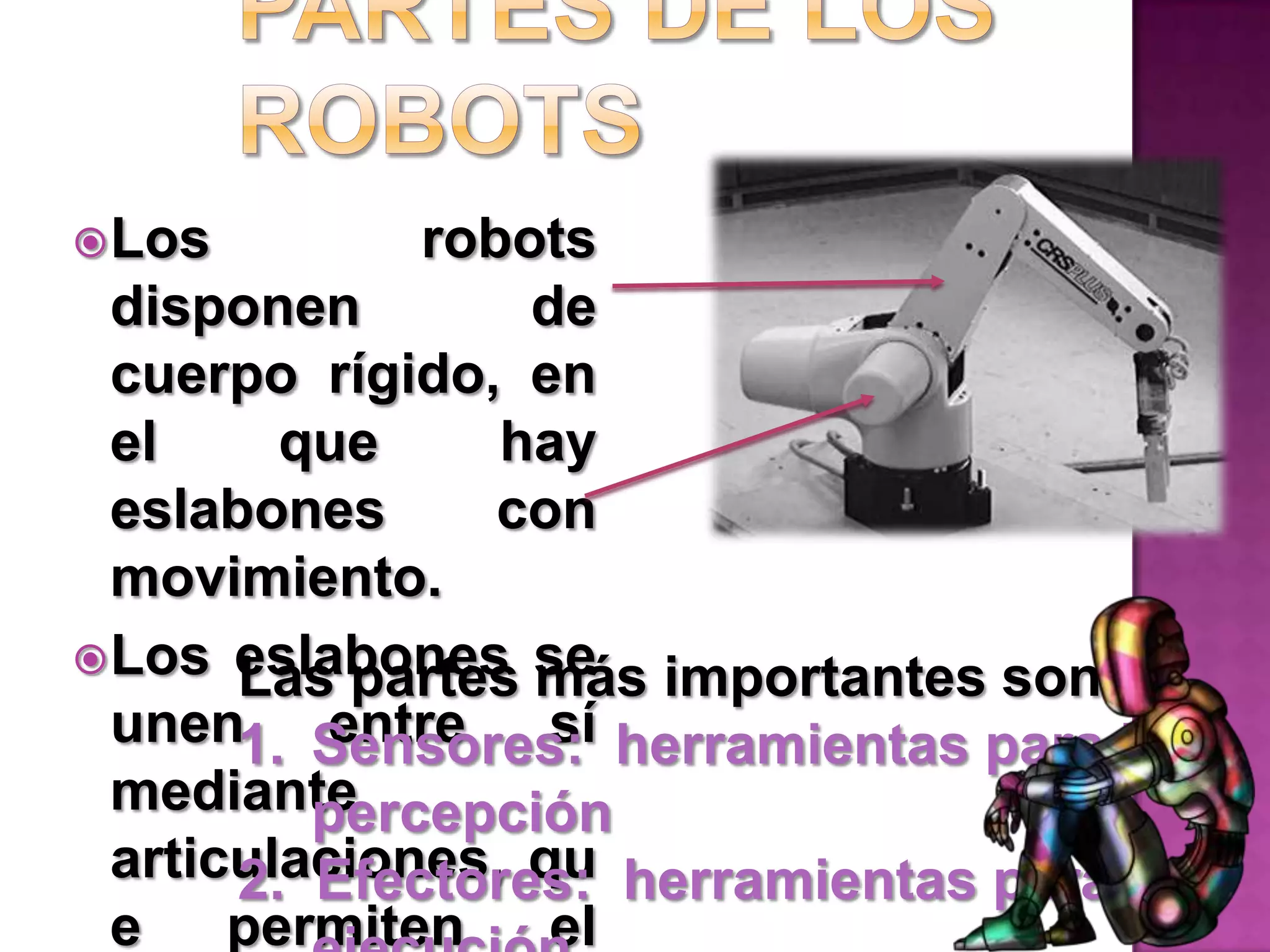 El documento describe las principales partes de un robot, incluyendo sensores y efectores. Los sensores como codificadores, odómetros y cámaras permiten al robot percibir su entorno, mientras que los efectores como ventosas, pinzas y pistolas para soldar le permiten manipular y transportar objetos. Las ruedas y llantas son comúnmente usadas para la locomoción del robot.