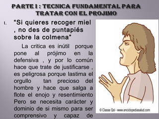 El documento presenta consejos para relacionarse positivamente con los demás. Primero, señala que la crítica es inútil y que es mejor ser comprensivo. Luego, indica que la mejor forma de desarrollar lo mejor en los demás es a través del aprecio y el aliento. Finalmente, explica que para influir en los demás hay que hablar de sus intereses y mostrar cómo lograr sus objetivos.