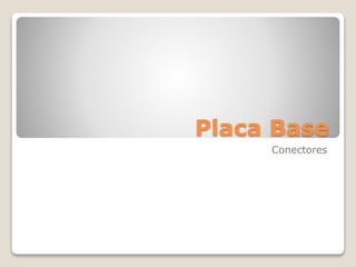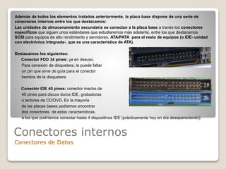 El documento describe los diferentes conectores internos y externos que se encuentran en una placa base. Entre los conectores internos se describen los conectores para unidades de almacenamiento como IDE, SATA, M.2 y SATA Express, así como conectores de energía, audio, USB y otros. Los conectores externos mencionados incluyen puertos para teclado, ratón, USB, FireWire, red, audio y video.
