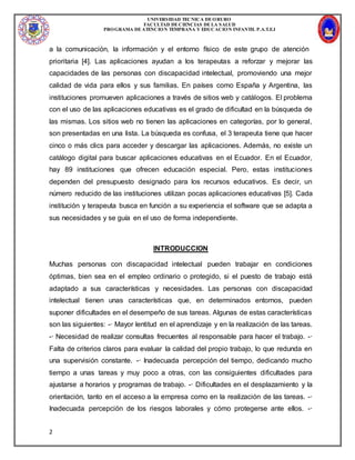 El documento describe el desarrollo de un catálogo digital para terapeutas que buscan aplicaciones educativas para personas con discapacidades intelectuales. Se realizó una búsqueda sistemática de sitios web y catálogos para identificar características y necesidades de usuarios. Luego, se implementó un prototipo de catálogo que categoriza aplicaciones por tipo de discapacidad y permite búsquedas en 3 clics o menos. El catálogo fue validado por terapeutas y se consideró una herramienta útil.