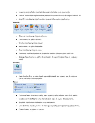 Este documento proporciona información sobre las diferentes fichas o menús en Excel 2010, incluyendo Insertar, Inicio, Diseño de Página, Fórmulas y Datos. Describe los grupos y elementos que componen cada ficha y explica su propósito y funcionalidad.