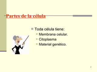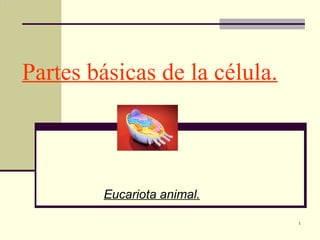 El documento describe las partes básicas de una célula eucariota animal, incluyendo la membrana celular, el citoplasma, el núcleo que contiene el material genético ADN, y las mitocondrias en el citoplasma. También explica que las células procariotas como las bacterias carecen de núcleo y organelas, y aunque algunas bacterias causan enfermedades, otras son beneficiosas para producir alimentos.