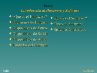 El documento describe los componentes fundamentales del hardware y software de una computadora. Define el hardware como los componentes físicos como el monitor, teclado, mouse, unidades de almacenamiento. Divide el hardware en dispositivos de entrada, salida y almacenamiento. Define el software como las instrucciones que permiten al hardware realizar tareas y divide el software en sistemas operativos y aplicaciones.