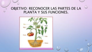 Este documento describe las partes principales de una planta y sus funciones. Las tres partes fundamentales de una planta son la raíz, el tallo y las hojas. La raíz se encuentra debajo de la tierra y su función es sujetar la planta y absorber agua y sales minerales del suelo. El tallo crece en sentido contrario a la raíz y sostiene las hojas, además de conducir la savia de la raíz a las hojas y flores. Las hojas sirven para respirar y llevar a cabo la fotos