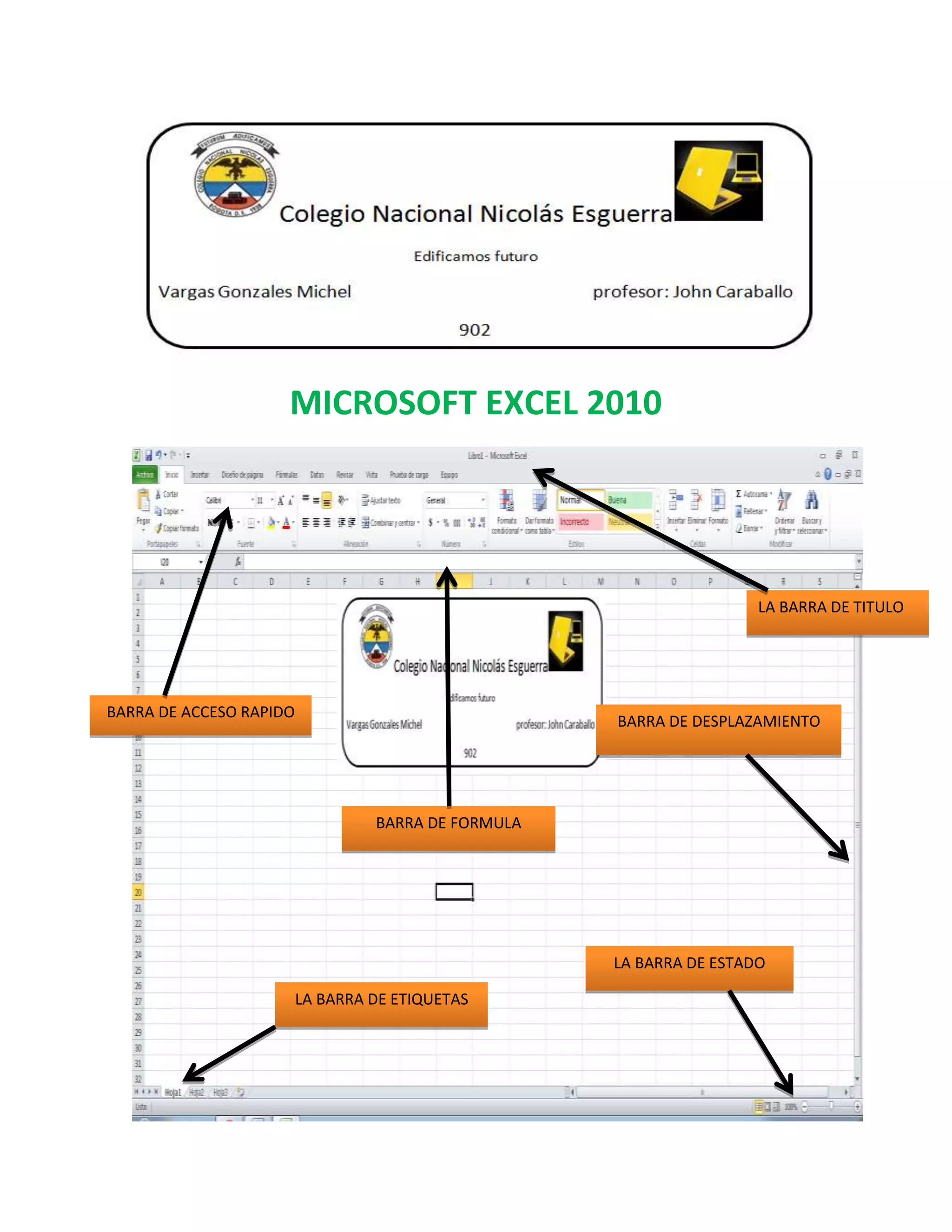 Microsoft Excel 2010 presenta varias barras que facilitan la navegación y edición de hojas de cálculo, incluyendo la barra de título, la barra de acceso rápido, la barra de desplazamiento, la barra de fórmula y barras para mostrar el estado y etiquetas de celdas.