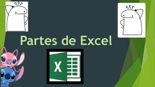 El documento describe las diferentes partes de la interfaz de usuario de Excel, incluyendo elementos como la barra de herramientas de acceso rápido, barra de título, y cinta de opciones. También menciona componentes funcionales como la barra de fórmulas, celdas, filas y columnas, así como opciones de navegación. Se abordan herramientas para compartir en la red y modos de presentación de la hoja de cálculo.