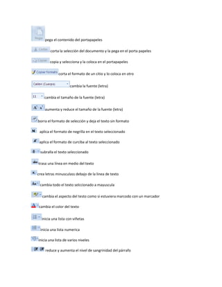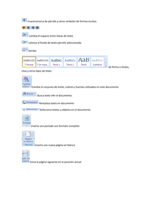 Este documento describe las diferentes herramientas y funciones disponibles en Microsoft Word para editar y dar formato a texto, como cambiar el estilo, tamaño y color de fuentes, aplicar formato de negrita, cursiva y subrayado, agregar listas, tablas, imágenes, gráficos y notas al pie o final, y realizar acciones como buscar y reemplazar texto, comprobar ortografía y gramática, y ver y controlar cambios.