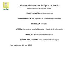 Este documento describe las principales partes de una computadora, incluyendo el gabinete, la CPU, la memoria RAM y ROM, el disco duro, la unidad de CD/DVD, el monitor, el mouse, el teclado, la tarjeta madre, la fuente de poder y tarjetas de video, sonido y red. También explica brevemente los diferentes tipos de redes de computadoras según su cobertura y topología.