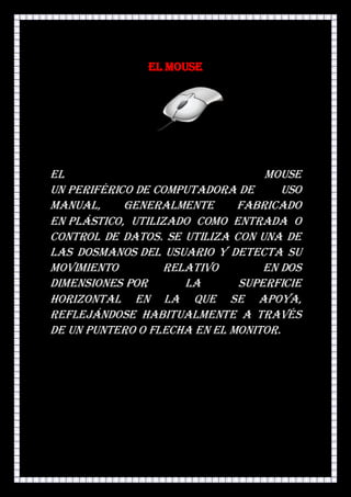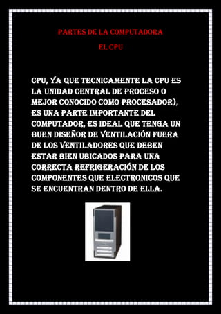 El CPU o procesador es una parte importante del computador que necesita un buen diseño de ventilación para refrigeración. El mouse es un periférico manual usado para entrada de datos que detecta movimiento en dos dimensiones. El teclado se usa para introducir órdenes y datos. El monitor muestra la interfaz y es importante prestarle atención a la salud. La tarjeta madre conecta los principales componentes como la CPU, memoria y otros. El disco duro almacena información, datos y programas de forma permanente. Los parlantes producen sonidos generados por