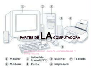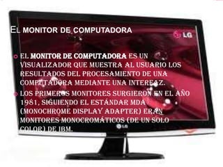 El documento habla sobre los principales componentes de una computadora. Explica que el monitor muestra la interfaz visual para el usuario, la tarjeta madre conecta los componentes y tiene el BIOS, el procesador ejecuta las instrucciones de los programas, la memoria RAM es donde se almacena la información temporal y los discos duros y unidades ópticas almacenan datos de forma permanente.