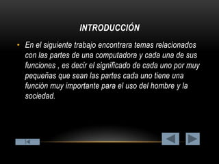 El documento describe las principales partes de una computadora, incluyendo la pantalla, teclado, memoria RAM, ratón, disco duro, unidad óptica, microprocesador, impresora, placa base y tarjetas de expansión. Explica brevemente la función de cada parte y concluye que todas son útiles para realizar trabajos en la computadora y que requieren mantenimiento para evitar fallas.