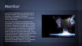 Este documento describe las principales partes de una computadora, incluyendo el monitor, teclado, mouse, CPU, micrófono, cámara web, impresora, equipo de sonido y auriculares. Explica brevemente la función de cada parte y su evolución histórica.