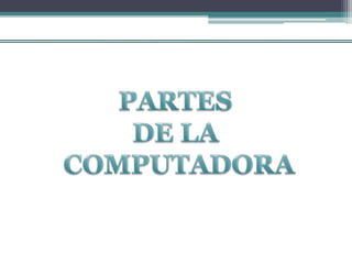 El documento describe los principales componentes de una computadora, incluyendo el monitor, el procesador, el teclado, la impresora, el escáner y varios dispositivos de almacenamiento como discos duros, USB y discos ópticos. También menciona algunas de las funciones básicas de una computadora como comunicación, procesamiento de texto, cálculos, juegos y búsqueda de información.