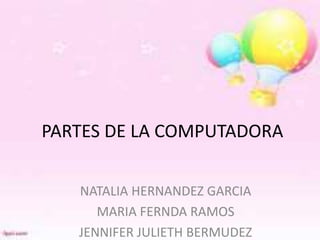 El documento describe las principales partes de una computadora, incluyendo el procesador, la memoria RAM, el disco duro, la unidad de CD/DVD, la tarjeta madre, las ranuras de expansión, el puerto USB, la tarjeta gráfica, la tarjeta de sonido, el teclado, la impresora, el mouse y el monitor. Cada parte juega un rol importante en el funcionamiento general de la computadora para procesar datos, almacenar información y permitir la entrada y salida de información.