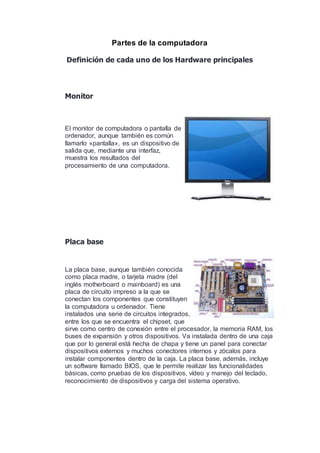 El documento detalla las partes esenciales de una computadora, incluyendo el monitor, placa base, CPU, memoria RAM, tarjetas de expansión, fuente de alimentación, unidad de disco óptico, disco duro, teclado y ratón. Cada componente se describe en términos de su función y estructura, así como su importancia dentro de la informática moderna. Se destaca que la comprensión de estos elementos es fundamental para el metabolismo del ordenador y su funcionamiento efectivo.