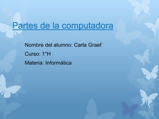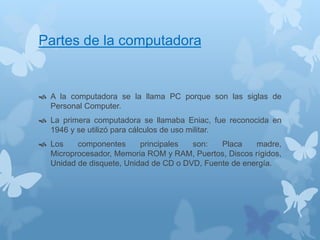 El documento describe las principales partes de una computadora, incluyendo la placa madre, el microprocesador, la memoria RAM y ROM, puertos, discos duros, unidades de disco y CD/DVD, y la fuente de energía. También distingue entre hardware, las partes físicas de una computadora, y software, los componentes lógicos que permiten realizar tareas. Además, enumera varios periféricos de entrada, salida y entrada/salida como el teclado, mouse, impresora y unidad de disco.