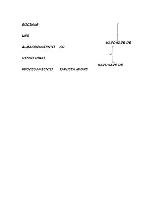 Este documento enumera las principales partes de una computadora, incluyendo hardware como teclado, mouse, pantalla, impresora y bocinas, así como diferentes tipos de software como sistemas operativos como Unix y MS-DOS, software de aplicaciones como Word y Excel, y software de mantenimiento. También menciona componentes internos de hardware como la tarjeta madre y el disco duro.