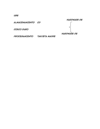 Este documento enumera las principales partes de una computadora, incluyendo hardware como teclado, mouse, pantalla, impresora y bocinas, así como diferentes tipos de software como sistemas operativos como Unix y MS-DOS, software de aplicaciones como Word y Excel, y software de mantenimiento. También menciona componentes internos de hardware como la tarjeta madre y el disco duro.