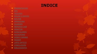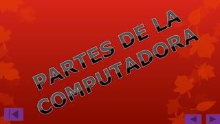 Este documento presenta las partes principales de una computadora, incluyendo el CPU, teclado, mouse, bocinas, impresora, scanner, memoria USB, monitor, auriculares, microfono, video camara, modem y lapiz optico. Explica brevemente la función de cada componente y concluye que una computadora es una herramienta importante que ayuda al progreso tecnológico y de la sociedad cuando todas sus partes internas y externas trabajan juntas.