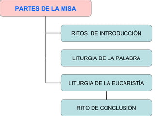 La misa o eucaristía católica consta de cuatro partes principales: los ritos de introducción, la liturgia de la palabra, la liturgia de la eucaristía y el rito de conclusión. Durante la liturgia de la palabra se leen pasajes bíblicos y se ofrece una homilía. Luego, en la liturgia de la eucaristía, el pan y el vino se convierten en el cuerpo y la sangre de Cristo durante la consagración, y los fieles reciben la comunión. Finalmente, la