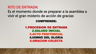 La misa católica se compone de cuatro partes principales: 1) los ritos de entrada, 2) la liturgia de la palabra, 3) la liturgia de la Eucaristía, y 4) los ritos de despedida. La liturgia de la palabra incluye las lecturas bíblicas y la homilía. La liturgia de la Eucaristía es el momento cumbre, donde el pan y el vino se convierten en el cuerpo y la sangre de Cristo a través de la consagración. Los fieles reciben la comunión