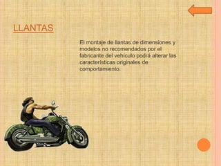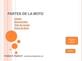 El documento lista las principales partes de una moto como llantas, direccionales, tubo de escape y freno de disco. Brevemente describe que las llantas de dimensiones no recomendadas pueden alterar el comportamiento del vehículo, las luces direccionales son importantes para la seguridad, el tubo de escape permite la salida de gases de la combustión y los frenos de disco ofrecen un mejor rendimiento que los de tambor.