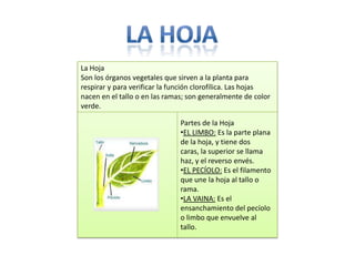 Las hojas son los órganos de las plantas que sirven para respirar y realizar la fotosíntesis. Están compuestas por el limbo, que es la parte plana, el pecíolo que une la hoja al tallo, y la vaina que envuelve el tallo. Las flores son los órganos reproductores de las plantas y están formadas por el cáliz, la corola, los estambres y los pistilos.