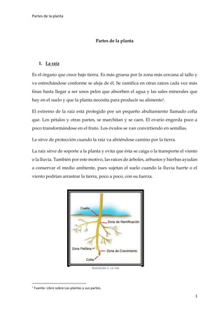 Este documento describe las cinco partes principales de las plantas: la raíz, el tallo, las hojas, las flores y el fruto y la semilla. Explica las funciones de cada parte, incluyendo que la raíz absorbe agua y nutrientes, el tallo transporta los nutrientes, las hojas realizan la fotosíntesis, las flores son los órganos reproductores y el fruto y la semilla contienen las semillas de la nueva generación. Incluye ilustraciones de cada parte.