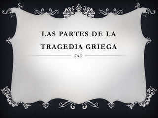 El documento describe las partes principales de una tragedia griega: el prólogo introduce el argumento y conflicto, los párodos son la primera intervención del coro cantando y bailando, los estásimos son la segunda entrada del coro sin danza donde el autor expresa ideas, los episodios desarrollan la acción a través de diálogos, y el éxodo es el canto final y salida del coro donde el héroe reconoce su error. También define el coro como un personaje que comenta y aconseja sobre la acción dramática.