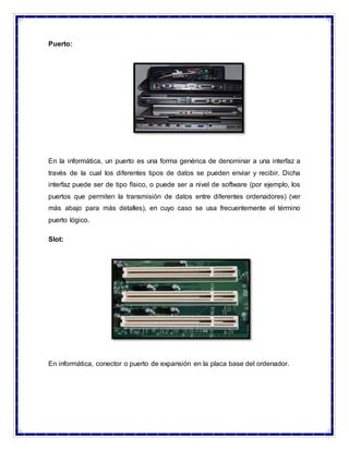 La tarjeta madre es una parte fundamental de una computadora que conecta los diferentes componentes. Contiene circuitos integrados como el circuito auxiliar que sirve como centro de conexión entre el microprocesador, la memoria RAM, las ranuras de expansión y otros dispositivos. Los puertos y ranuras de expansión en la tarjeta madre permiten conectar tarjetas adicionales para expandir las capacidades de la computadora, como tarjetas de video, de red o de sonido.