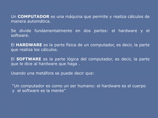 Un computador se divide en hardware y software. El hardware es la parte física que realiza los cálculos, mientras que el software es la parte lógica que le dice al hardware qué hacer. El hardware incluye dispositivos de entrada, salida, comunicaciones, almacenamiento y procesamiento. La memoria RAM almacena temporalmente la información que el computador está usando.