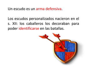 El documento proporciona una guía sobre las partes y características de un escudo heráldico, incluyendo su historia, perfiles, colores y elementos decorativos. Se destaca la importancia de la simetría, el relleno adecuado y las proporciones en el diseño de escudos. Además, se menciona que esta información está destinada a una actividad de dibujo heráldico para alumnos de 2º de ESO.
