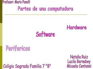Este documento describe los diferentes tipos de periféricos de una computadora, incluyendo periféricos de almacenamiento como discos duros y unidades USB, periféricos de entrada como teclados y mouse, y periféricos de salida como monitores y bocinas. Explica que los periféricos de almacenamiento almacenan datos de forma temporal o permanente, los periféricos de entrada permiten que el usuario ingrese información a la computadora, y los periféricos de salida permiten que la información salga de la computadora de forma visual,